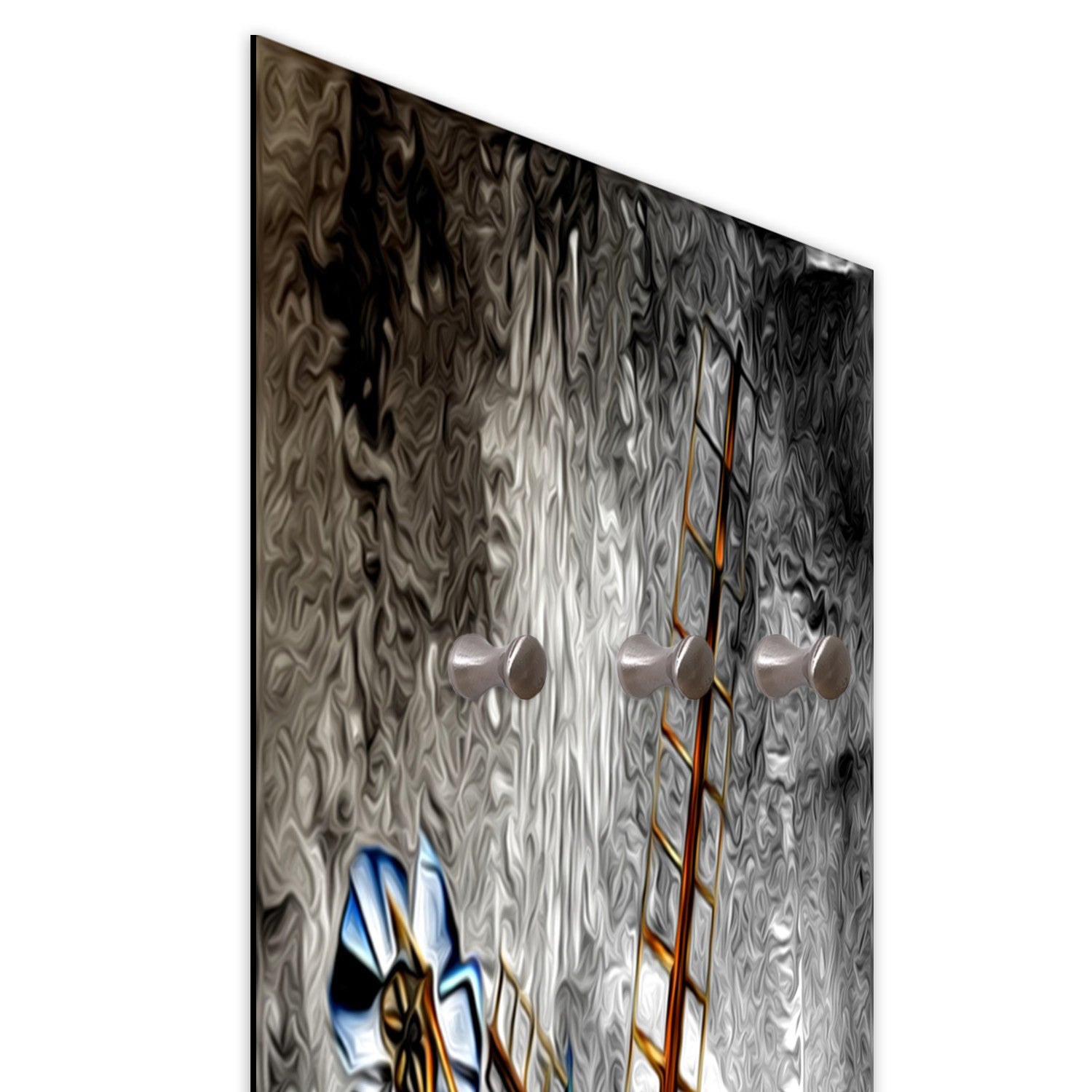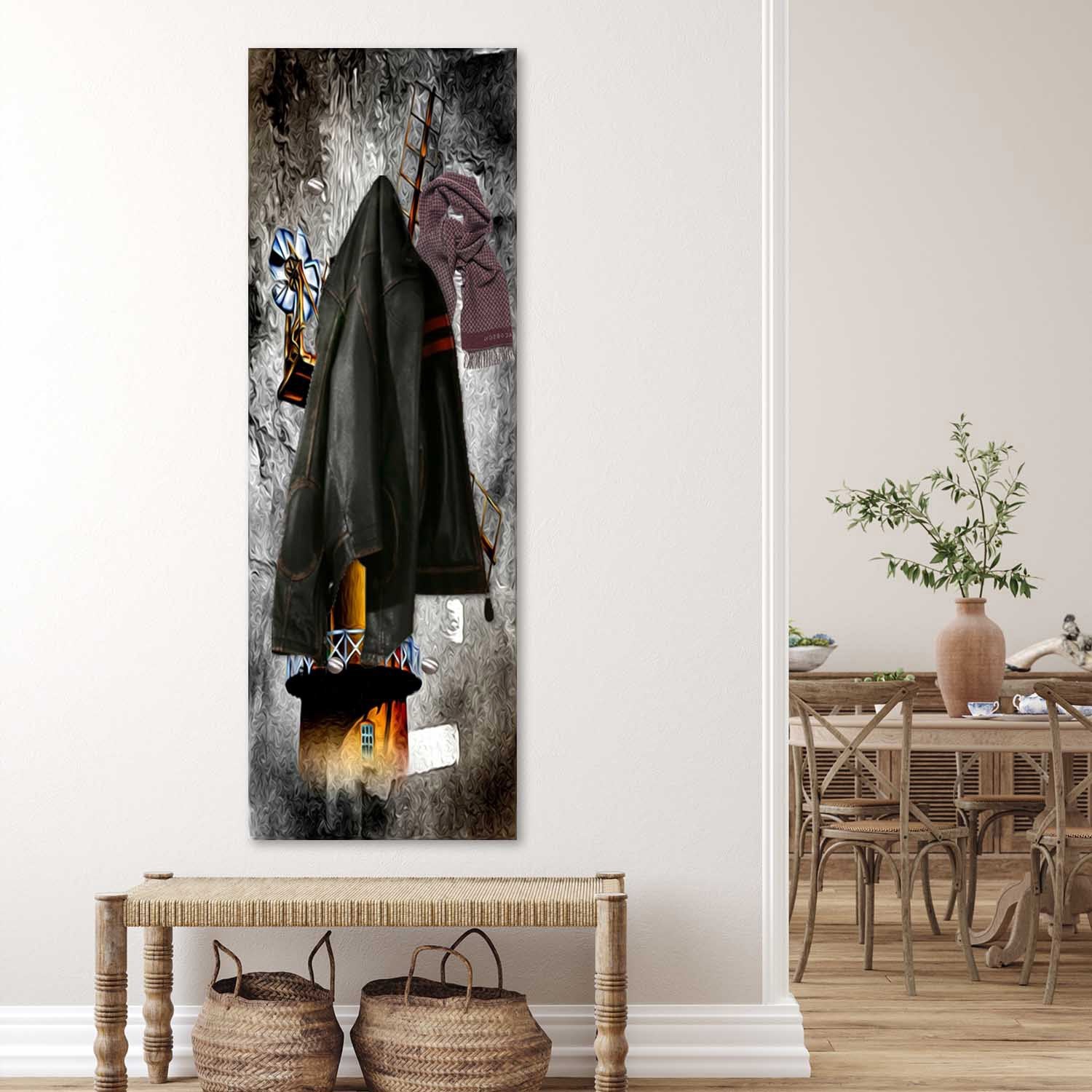 Nugarinė kabyklos dakis yra iš 1,5 cm storio MDF karkaso, kuris sukuria įdomų vizualinį 3D efektą. Grafika spausdinama ant 200 gsm atlasinio popieriaus ir klijuojama ant 3 mm storio HDF plokštės. Spausdinant naudojame tik saugius ekologiškus dažus.